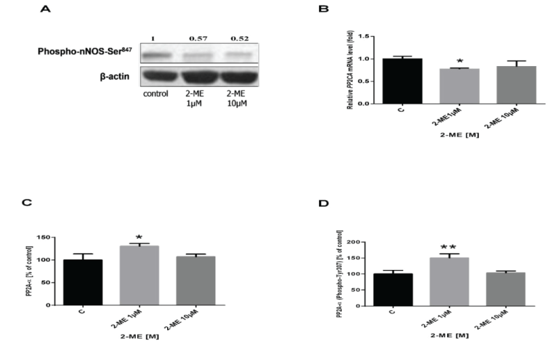 | Figure 1: Effects of treatments with 2-ME on inactive pool of nNOS in OS 143B cells were treated with 2-ME (1 μM, 10 μM) for 8 hours. (A): Afterword, the proteins were separated and analyzed by western blot method. 2-ME was demonstrated to decrease protein level of phospho-nNOS-Ser847. A representative experiment of three performed is shown. (B,C): Level of PP2A-α (B) and PP2A-α (Phospho-Tyr307) (C) were determined by ELISA assay. Values are the mean ± SE of three independent experiments (N=6 replicate cultures). The absence of error bar denotes a line thickness greater than the error. *P<0.01, **P<0.001 versus control cells (C). (D): The levels of PP2CA transcript was determined by means of Real time PCR. Values are mean ± SE of three independent experiments, relative mRNA levels of PP2CA/RPL37A are presented. *P<0.01 versus control cells (C). |