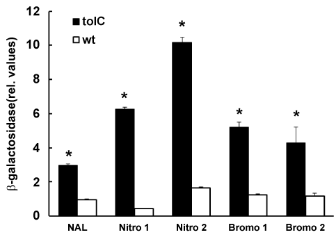 spy::lacZ fusion. The wild type (M5402) and tolC mutant (M5403) strains were grown for 2.5 h in the presence of various thiazolides, nalidixic acid (Nal; all 1 μM) or DMSO as a solvent control. Beta-galactosidase activity was determined as described [18] and expressed as relative values to the corresponding solvent controls of each strain. Mean values (± SE) are given in triplicates. Values marked by asterisks are significantly different between the treatments and the solvent control (paired t-test, two-sided; *, P<0.01). |