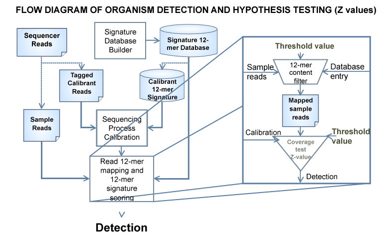 | Figure 1: Process flow for detecting constituent organisms in a test sample using a “noise” calibration, n-mer read filtering to deconvolve a mixture, and a hypothesis test (Z-value). The hypothesis test measures deviation of the observed matching rate of n-mers data against a reference genome’s n-mers, and compares it to the mean deviation of a known organism (calibrant) against its reference when sequenced in same run. The Z value is the deviation expressed in terms of standard deviations of measurements for the calibrant. |