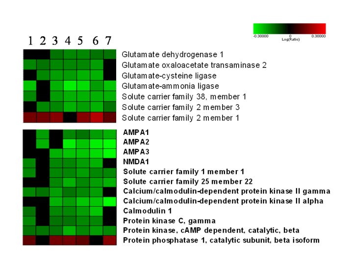 | Figure 6: Heatmap showing differentially expressed genes in hippocampus from Tg2576 mice relative to WT controls that are involved in glutamate transmission, both presynaptically and postsynaptically. The heatmap conditions are the same as in Figure 4. |