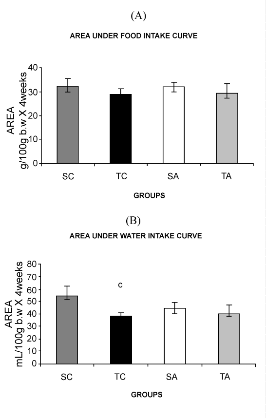 | Figure 2A e 2B: Area under food (A) and water (B) intake curve of the animals from weaning (28 days) and to the end of the experiment (60 days). Results expressed as mean ± standard deviation; n=10 animals per group. SC= Sedentary control; Trained control =TC; Trained alloxan =TA; Sedentary alloxan =SA. (Two-way ANOVA, P <0.05). c = SCx TC. |