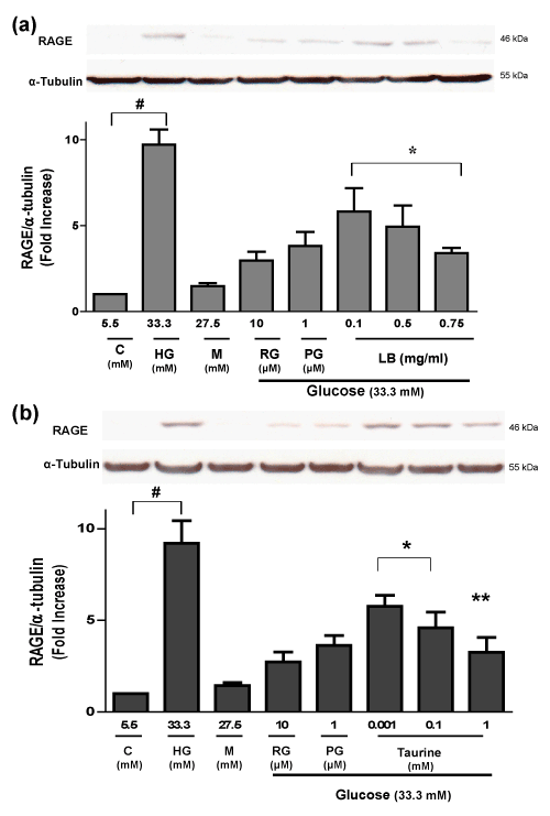 | Figure 1: Effects of (a) LB extract (0.1. 0.5 and 0.75 mg/ml) and (b) taurine (0.001, 0.1 and 1 mM) on protein expression of RAGE in high glucose-treated ARPE-19 cells. The relative levels of protein for RAGE was assessed by the immunoblotting method, and normalised to α-tubulin. Levels in control were arbitrarily assigned a value of 1.0. Values are means ± SEM (n=4). #P<0.001 versus Control, *P<0.05, **P<0.01 versus high glucose (HG). RG (10 μM) and PG (1 μM) were used as a positive controls. Mannitol (M) served as osmotic control. |