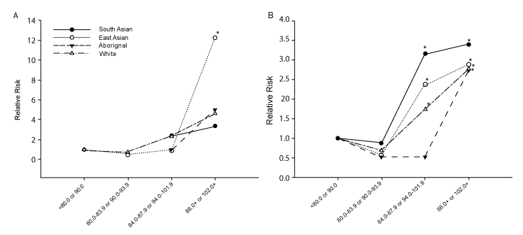 | Figure 2: The multiple linear regression risk ratio for diabetes (A) and dysglycemia (B), adjusted for age and gender, across waist circumference measures, by ethnic group among participants evaluated from 2007-2011 in British Columbia. |