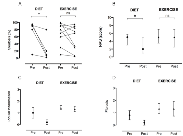| Figure 3: Effect of diet and exercise interventions on steatosis and disease severity. Individual change in steatosis (Panel A, *p<0.05 Wilcoxon signed rank test) and median score change in NAFLD activity Score (NAS) (Panel B, *p<0.05Wilcoxon signed rank test), Lobular inflammation (Panel C, p<0.05RMANOVA for time x treatment difference between groups at 6 months) and Fibrosis (Panel D, p=NS) assessed by liver biopsy pre and post intervention. Symbols • depicts DIWL and  depicts EX group. |