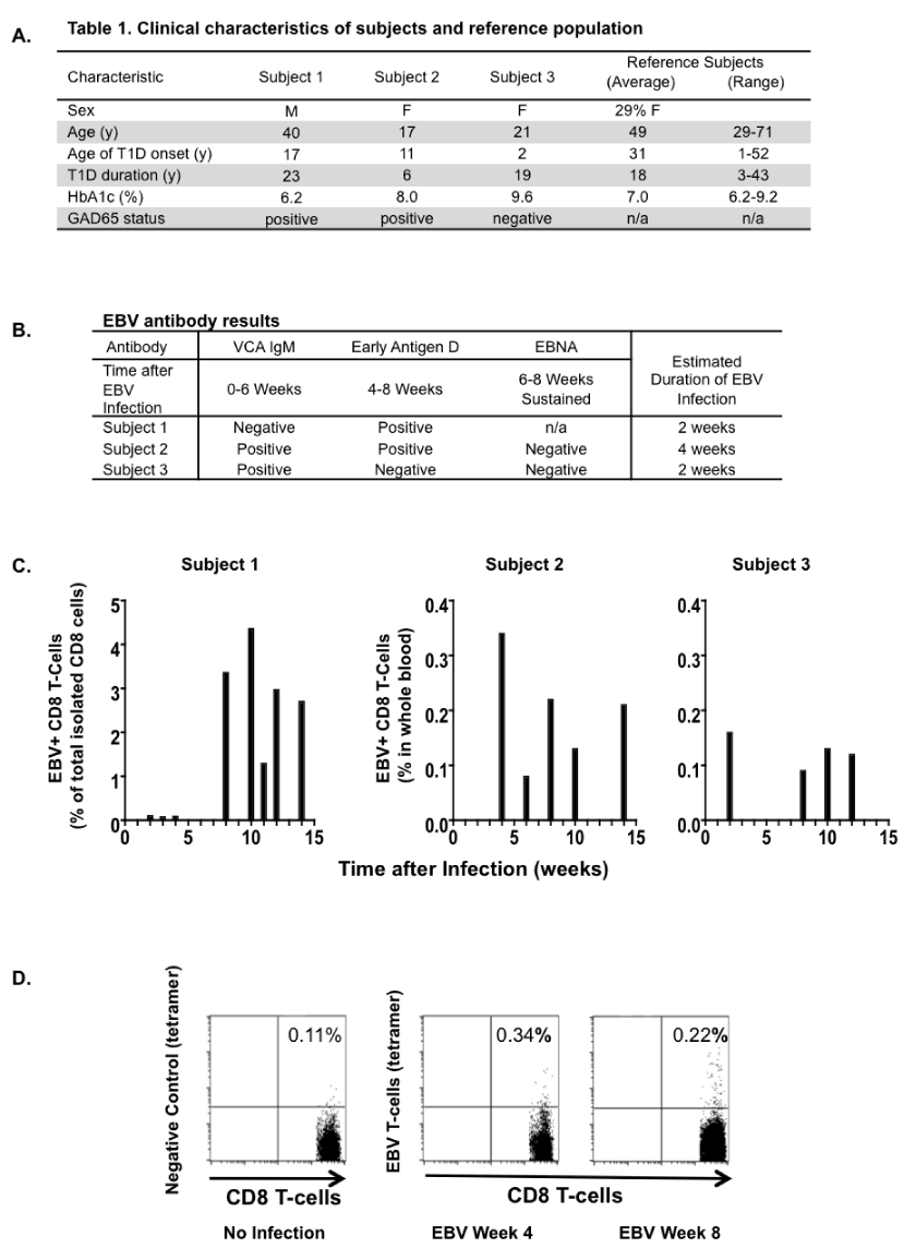 | Figure 1: Clinical characteristics and time course of EBV infection. A. Summary of clinical characteristics for the three EBV subjects. B. Results for EBV antibody testing on blood samples drawn during the first visit for the three EBV subjects and correlation with estimated start of EBV infection. C. Time course of the appearance of EBV-specific T-cells in Subject 1, Subject 2 and Subject 3. As detailed in the Materials and Methods, the staining for EBV reactive T-cells in Subject 1 was performed on isolated CD8 T-cells; the staining for EBV reactive T-cells for Subject 2 and Subject 3 was performed on whole blood lysates with CD8 T cells identified with CD8 antibody. In the graphs, time point 0 indicates the estimated occurrence of EBV infection, based on the timing of the appearance of antibodies directed against EBV. D. Representative dot plots of flow cytometry results. Level of non-specific tetramer binding by CD8 T-cells was determined using a tetramer loaded with an irrelevant peptide sequence (Negative Control, left panel). The middle and right panels show examples of positive staining using EBV-specific tetramers. |