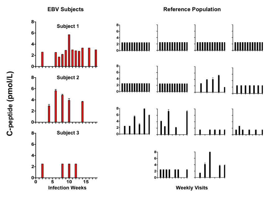 | Figure 2: Time course of C-peptide levels in the EBV-infected subjects versus a reference population of Type 1 Diabetics without active EBV infection. Subjects 1 and 2 showed a transient increase in C-peptide that was statistically significant as compared to the reference population (p<0.04 and p=0.00134, respectively). Subject 3 did not show increased C-peptide levels. |