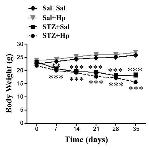 | Figure 4: Monitoring of body weight of diabetic mice treated with Hp. Body weight was monitored prior to any treatment (time 0), 7 days after STZ or Sal injection and after 7, 14, 21 or 28 days of HP treatment. Data are mean ± S.E.M. 11 animals per group. ** p <0.01, *** p <0.001 (Two-way ANOVA followed by Bonferroni post-test). |