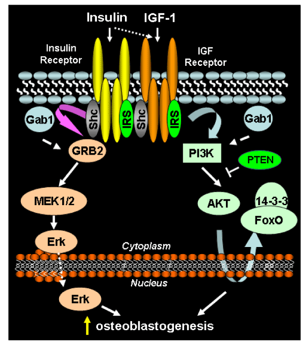 | Figure 1: Pro-osteoblastogenic signal transduction by insulin and IGF1 receptors. Receptors at the plasma membrane bind ligands within extracellular domains, triggering receptor autophosphorylation on tyrosine residues within the cytoplasmic domain. Phosphorylated receptors recruit scaffolding proteins [src homology 2 domain-containing transforming protein C (Shc), IRS], which are subsequently phosphorylated by the receptor kinase domain. Recruitment of growth factor receptor bound protein 2 (GRB2) to the receptor-Shc complex initiates phosphorylation and activation of the MEK/ERK pathway. MEK/ERK signaling culminates with phosphorylation of osteoblastogenic transcription factors in the nucleus. IRS proteins recruit phosphatidylinositol 3-kinase to the receptor complex, resulting in kinase activation, which generates phosphatidylinositol (3,4,5) triphosphate (PIP3). PIP3 recruits AKT to the plasma membrane, resulting in AKT activation. Activated AKT phosphorylates numerous proteins, among them FoxO1, resulting in retention of FoxO1 in the cytosol, where it is unable to perform its function as a transcription factor. |