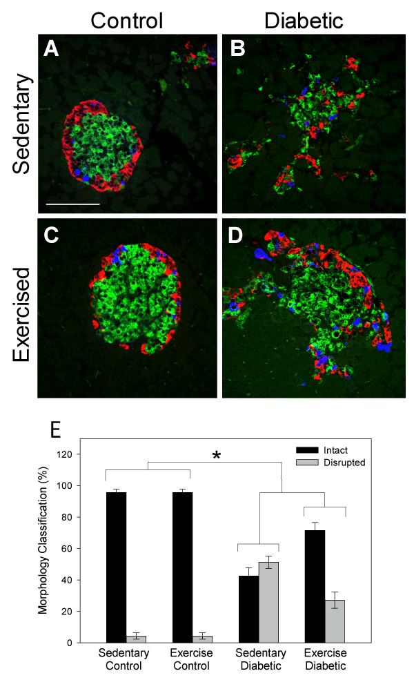 | Figure 2: Islet Morphology. Pancreatic sections were stained for insulin (green), glucagon (red) and somatostatin (blue) A) A representative islet from a sedentary lean control rat shows that in sedentary animals there is a mantle around the islet made of glucagon and somatostatin. Insulin-producing β-cells are in the core of the islet. B) Sedentary diabetic rat islets clearly contained regions devoid of insulin, glucagon, or somatostatin staining. Islets with sections void of hormone staining were classified as disrupted. C) Exercise did not change the shape or orientation of the cells in the control animals. D) However, exercise improved islet shape in the diabetic rats. E) Quantification of islet classifications of intact and disrupted shows no effect of exercise in the control rats, and a dramatic decline in the percentage of intact islets with diabetes (p < 0.001). Exercise of the diabetic groups significantly increased the percentage of intact islets and decreased the percentage of disrupted islets (p < 0.001). Scale bar represents 100 µm. |