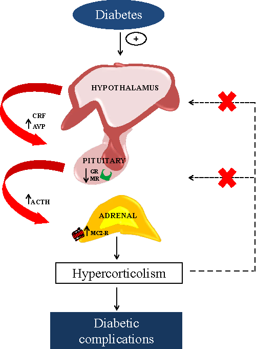 diabetes. Diabetes induces increase in AVP, ACTH and MC2R levels and decrease of glucocorticoid negative feedback. The impaired of negative feedback in diabetics is related with reduction of GR and MR expression in pituitary. Together, these alterations in HPA axis lead to increase of glucocorticoid levels culminating in the development and/or aggravation of diabetic complications. |
