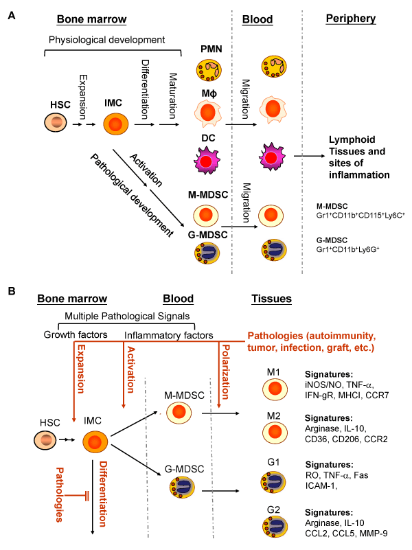 | Figure 2: Multiple Steps in the Development of Myeloid Cells and MDSC. (A) In physiological conditions, hematopoietic stem cells (HSC) undergo a series of expansion, differentiation, and maturation in bone marrow. Mature myeloid cells migrate to the periphery via blood vessels and replenish peripheral pool of myeloid cells. In pathological conditions, mediators of pathologies deter and divert normal HSC development to pathological development, distinguished by an increase of IMC expansion and activation. These immature myeloid cells, i.e., MDSC, migrate to the peripheral lymphoid tissues and sites of inflammation. MDSC can be categorized into two subsets, monocytic (M)-MDSC and granulocytic (G)-MDSC, by their markers (CD11b, Ly6C and Ly6G) and suppressive activities (20, 33, 36). (B) The inflammatory mediators of pathologies can regulate three developmental stages of MDSC from expansion to activation and polarization. In terms of polarization, these mediators dictate MDSC subsets to skew into M2 M-MDSC and G2 G-MDSC. Polarized MDSC subsets can be distinguished by a distinct set of signature genes in relation to their functions. M2/G2 cells produce arginase, anti-inflammatory cytokines and chemokines, eventually converging to the establishment of immune tolerance (and pro-tumoral activities). In marked contrast, M1 and G1 cells produce iNOS, NO, inflammatory cytokines and chemokines, leading to their immunogenic effects (and tumoricidal activities). Whether MDSC polarization is an irreversible process or a reversible hyperactivation state remains elusive (34). |
