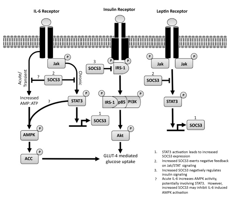 | Figure 1: IL-6, insulin, and leptin signaling in skeletal muscle. Chronic low-grade inflammation is associated with increased levels of IL-6, which leads to increased phosphorylation of STAT3, and subsequent increased SOCS3 expression. Increased SOCS3 mediates the inhibitory effects of IL-6 on insulin signaling and glucose uptake. SOCS3 directly disrupts insulin signaling by binding to IR and preventing interaction with IRS-1 (primarily in skeletal muscle and adipose tissue) / IRS-2 (primarily in the liver), and may target IRS-1/IRS-2 for degradation. Disrupting the early signaling events also has downstream effects on other proteins in the insulin pathway including PI3K and Akt, ultimately leading to insulin resistance and attenuated GLUT-4 mediated glucose uptake. Chronically elevated leptin levels also leads to increased SOCS3 expression, which can also directly inhibit insulin mediated glucose uptake. In addition, SOCS3 can have indirect effects on glucose uptake; increased SOCS3 leading to leptin resistance, and impaired leptin mediated AMPK activation. In contrast, acute/transient IL-6 elevations in response to exercise do not cause sustained increased SOCS3 expression, but cause increased insulin sensitivity in peripheral tissues by increased AMPK activity and subsequent increased glucose uptake. IL-6 mediated activation of AMPK in response to exercise is blunted in chronic inflammatory states. Since IL-6 is required for exercise-induced AMPK activation and obesity results in a blunted exercise-induced activation of AMPK, it is possible that increased SOCS3 may cause IL-6 resistance, which results in diminished AMPK activity and increased insulin resistance. IL-6: Interleukin-6; STAT3: Signal Transducer and Activator of Transcription 3; SOCS3: Suppressor of Cytokine Signaling 3; IR: Insulin Receptor; IRS: Insulin Receptor Substrate; PI3K: Phosphoinositide 3 Kinase; GLUT-4: Glucose Transporter 4; AMPK: AMP activated Protein Kinase |
