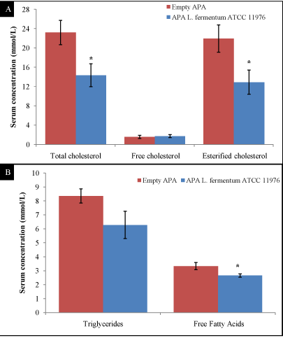 | Figure 6: Clinical effects of microencapsulated L.f. 11976 on lipid metabolism in Golden Syrian hamsters; (A) serum total cholesterol (*p < 0.05), serum free cholesterol and esterified cholesterol (*p < 0.05) and (B) serum triglycerides and non-esterified (free) fatty acids (*p<0.05). Data represents the mean ± SEM (n = 12). |