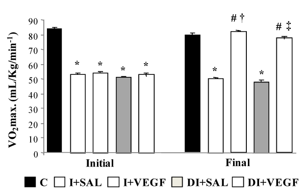 | Figure 2: Maximal oxygen consumption (VO2max) evaluated 2 and 31 days after pHuVEGF165 or saline intramyocardial injection in control (C), myocardial infarction + saline (I+SAL), myocardial infarction + VEGF (I+VEGF), diabetes + myocardial infarction + saline (DI+SAL), and diabetes + myocardial infarction + VEGF (DI+VEGF) groups. # p<0.05 vs. initial evaluation; * p<0.05 vs. C; † p<0.05 vs. I+SAL; ‡ p<0.05 vs. DI+SAL; (n=8 for each group). |