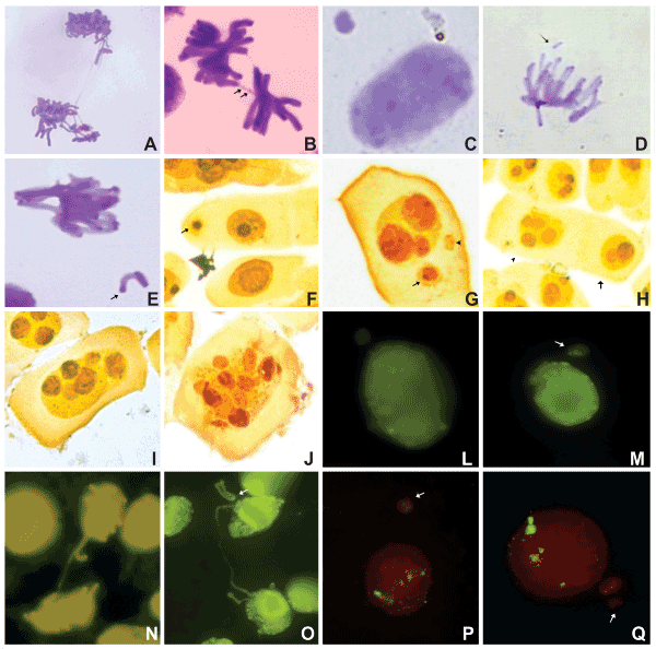 | Figure 4: Allium cepa meristematic cells treated with the Black Dye Commercial Product and submitted to the Chromosome Bandings and Fluorescent in situ Hybridization (FISH). A-E. C-Banding. A-B. Anaphases with chromosome bridges: A. without C-banded region and B. with C-banded regions (arrows); C. Cell with micronuclei without C-banded region; D. Chromosome fragment with one C-banded region (arrow); E. Metaphase with chromosome loss, presenting C-banding in telomeric regions; F-J. NOR-Banding. F-G. Micronuclei: F. with nucleolus organizer region (arrow); G. with nucleolus organizer region (arrow) and without nucleolus organizer region (arrow head); H. Cells with two (arrow) and four nucleoli (arrow head); I. Cell with six nucleoli; J. Cell with ten nucleoli; L-O. CMA3 Banding. L-M. Micronuclei: L. without CMA3-banded region and M. with CMA3-banded regions (arrow); N. Anaphase with chromosome bridge without CMA3-banded region; O. Telophase with chromosome bridge without CMA3-banded region and with chromosome loss showing CMA3-banded region (arrow); P-Q. FISH. P. Micronuclei with various small hybridization signals (arrow); Q. Micronuclei without hybridization signal (arrow). |