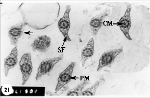 | Figure 21: TEM of T.S. of flagellum of O. niloticus of LM showing the shortage in length of side fins (SF), the ring of nine doublets peripheral microtubules (PM) and central pair of microtubules (CM). Notice disruption& irregular wall of the side fins (SF) (arrow). (X 30000). |