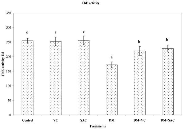 | Figure 3: Effect of repetitive doses, for 28 consecutive days, of DM and different antioxidants on ChE activity in sera of rat. Values are expressed as mean ± S.D. of 6 rats; a, b, c values are not sharing superscripts letters (a, b, c,) differ significantly at p < 0.05; ChE: cholinesterase; DM: dimethoate; VC: vitamin C; SAC: synthetic antioxidant compound. |