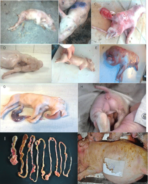 | Figure 1: Selected pictures of malformed Danish piglets. A: spinal deformation, B: ear is not formed, C: cranial deformation, D: cranium hole in head, E: piglets born alive having short legs and one eye not developed, F: one large eye, an elephant trunk with bone in it, G: elephant tongue, H: female piglet with testes, I: fore gut and hind gut of the piglet with swollen belly are not connected, J: malformed piglet with swollen belly. |