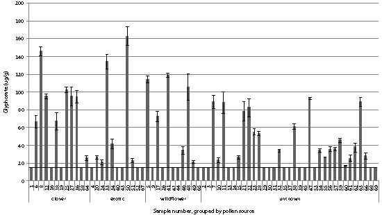 | Figure 3: Concentration of glyphosate (ng/g) in honey samples by flower (pollen) source. Dashed line represents LOQ of method (15 ng/g). Exotic flowers were sophora, manuka, orange, cactus, summer flower, lychee, alfalfa, acacia.). Error bars represent concentrations obtained during duplicate analysis. |