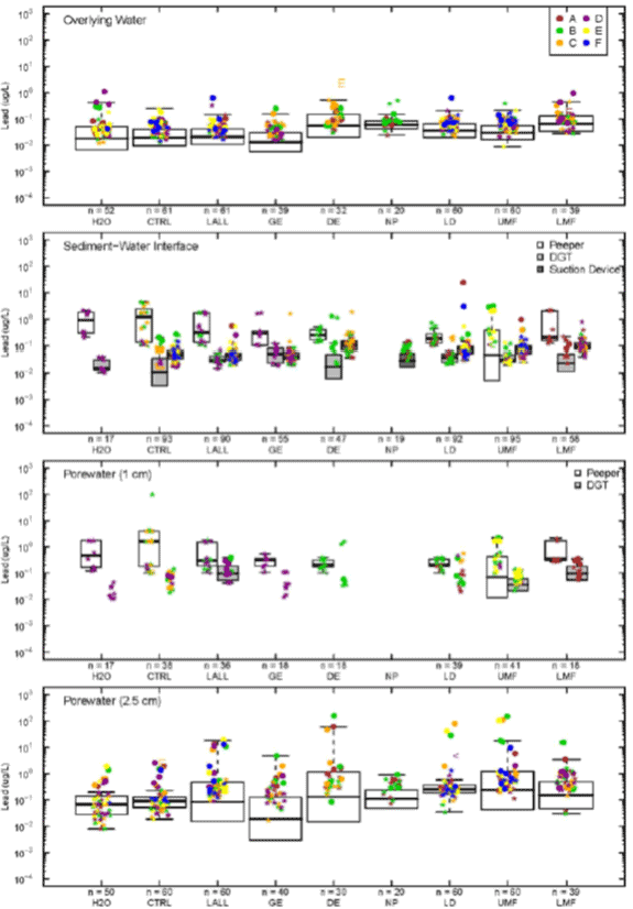 | Figure 5: Concentrations of dissolved lead (Pb) as a function of treatment and sample type. Samples types are presented in the following order: overlying water (top panel), sediment water interface water (2nd panel), pore water at 1 cm (3rd panel), and pore water at 2.5 cm (bottom panel). Where appropriate and applicable, concentrations as determined by use of different sampling techniques are identified within the top right-hand corner of respective panels. Individual measurements are shown as circles and color represents replicates, measurements below detection are illustrated with a less than symbol (“<”) plotted at the detection limit, qualified samples due to blank contamination are illustrated with an asterisks (*), and date qualified as “estimated” are represented with the symbol “E” at the estimated value. The 25th and 75th centiles from the maximum likelihood estimate (MLE; see Supplemental Materials) calculated distribution is used for the edges of the box, the median is shown as a horizontal line drawn through the middle of the box. Whiskers show maximum and minimum values exclusive of extreme values. Extreme values were identified as values that were more than 1.5 times the inter-quartile range above the 75th or below the 25th centiles. Treatments included negative controls with water only (H2O) and artificial sediment (CTRL), reference sediments from Lower Arrow Lake (LALL) and Genelle (GE), and site sediments from Deadman’s Eddy (DE), Northport (NP), Little Dallas (LD), Upper Marcus Flats (UMF) and Lower Marcus Flats (LMF). |