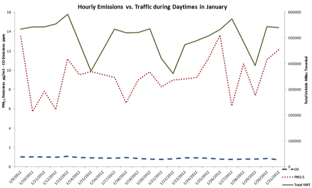 | Figure 8: Traffic volume (Vehicle Miles Traveled) collected hourly graphed with PM2.5 hourly (μg/m3) and CO hourly (ppm) data during the daytime (7am to 6pm). Traffic data was available in January for 2012. Particulate data was available each January from 2008 to 2010. CO data was available each January from 2000 to 2010. Each were averaged over all years available. |