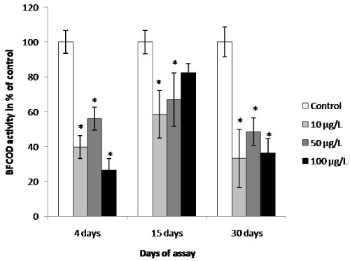 | Figure 2: Evolution of liver BFCOD activity in juvenile common carp exposed to different concentrations of carbofuran for 4, 15, and 30 days. Data represent the mean ± SE (n=7). Note: *indicates significant difference between control and pesticide group (p<0,05). |