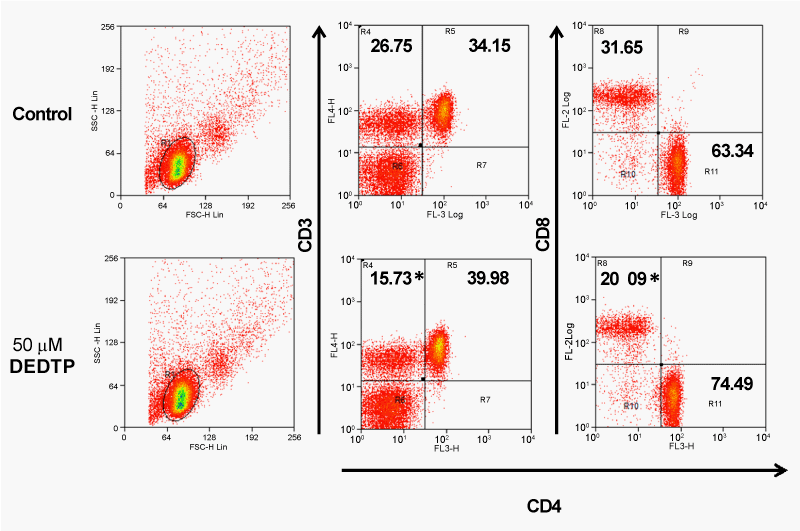 | Figure 1: DEDTP exposure modifies the proportion of T-CD8-positive lymphocytes in resting PBMCs. The PBMCs were treated with 50 μM DEDTP for 24 h. Cells were stained with anti-CD3-APC, anti-CD4-PerCP and anti-CD8-PE; their expression was assessed by flow cytometry in 10000 events. One representative experiment of four. Mean ± SD (n=8), *p<0.05, Student’s t-test. |