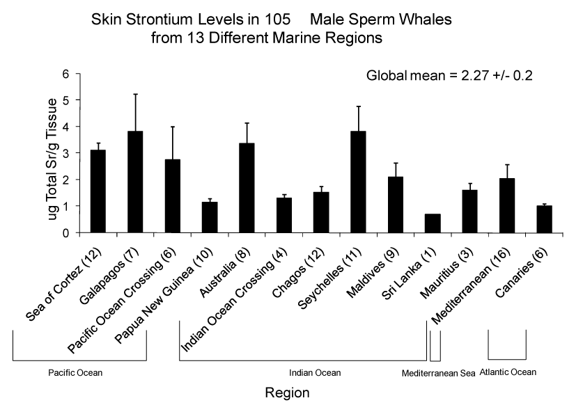| Figure 4: Global Distribution of Strontium Levels in Male Sperm Whales. This figure shows the global distribution of mean Sr levels in 105 male sperm whales grouped by sampling region. 1No male whales were found in the Cocos or Kiribati regions; 2Specific regions are named for the nearest body or ocean region; 3All data are presented in ug total Sr/g tissue wet weight +/- standard error. Regions that differed for males (p < 0.05): Canary Islands with Sea of Cortez; and Papua New Guinea with Sea of Cortez and Seychelles. |