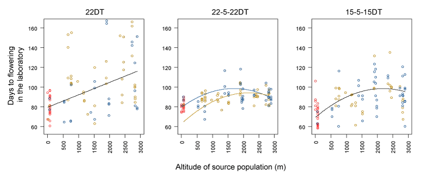 | Figure 3: Scatterplots of flowering time (days after germination) as a function of the altitude of the source population in the three treatments: (left) 22-°C day temperature with no vernalisation, (middle) 22-°C day temperature with a 5-°C vernalisation treatment followed by a return to the 22-°C day temperature, and (right) 15-°C day temperature with a 5-°C vernalisation treatment followed by a return to the 15-°C day temperature. Points represent the mean value for each lineage for the first (blue) and second (gold) laboratory generations of ssp. kamchatica and the second laboratory generation of ssp. kawasakiana (red). Regression lines for the left and middle plots were derived from the same best-fit non-linear mixed-effects model based on data from individual plants, with population and lineage as random effects (Table 4). The data in the right plot were obtained in a different growth chamber and were analysed separately (Table 5). In the middle graph, the colours of the three lines correspond to those of data points. The red line for ssp. kawasakiana is drawn within the short altitude range of this subspecies. Where a single black line is shown (left and right graphs), the flowering time for different generations and subspecies were regressed together. |