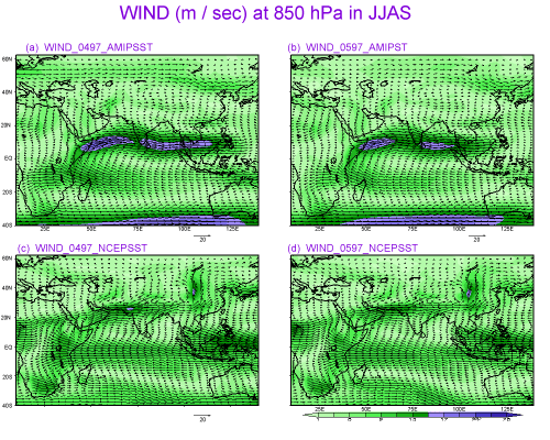 | Figure 5: Spatial distribution of JJAS Wind(m/s) at 850hpa for the year 1997 (a) AMIPSST with initial condition of 1st April 1997 (b) AMIPSST with initial condition of 1st May 1997 (c) NCEPSST with initial condition of 1st April 1997 (d) NCEPSST with initial condition of 1st May 1997. |