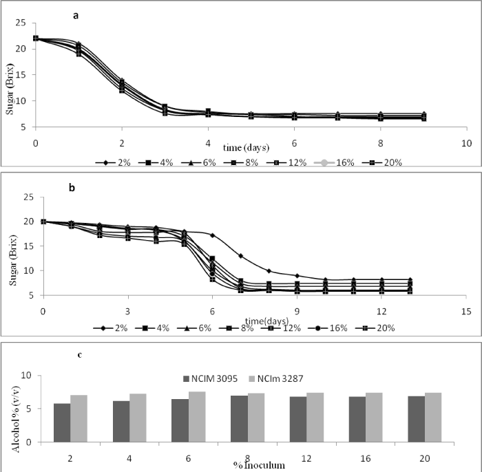 | Figure 3: Decrease in sugar level (TSS) with fermentation time for guava wine production at different inoculum percentage for fermentation with (a) Saccharomyces cerevisiae NCIM 3095 and (b) Saccharomyces cerevisiae NCIM 3287. Comparison of alcohol productions by varying inoculum percentage of (c) Saccharomyces cerevisiae NCIM 3095 and NCIM 3287in guava wine production. |