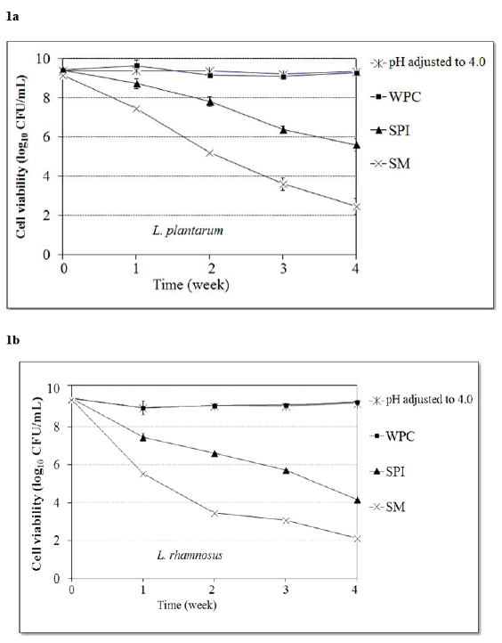 protein isolate (SPI) and skim milk (SM). The data presented in this figure are means of triplicate experiments ± standard deviation. The variation of cell viability is found to be significantly different at the level of p≤0.001 between seabuckthorn juices containing different ingredients and between different time intervals (week) based on one-way ANOVA. |