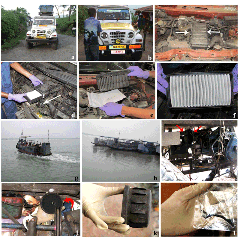 | Figure 2: a) Sampling vehicle used on Kalimpong to Darjeeling route; b) Sampling vehicle used on Darjeeling to Siliguri route along the Teesta Valley; c, d) Position of air-filters in an engine of a motor car (white arrow) driving along the Darjeeling to Siliguri route; e) Collecting dust samples from the airfilter of a motor car; f) An air-filter of a motor car; g, h) Photographs of motor boats travelling around different islands of the Sundarbans (West Bengal); i) Red arrows indicate the position of the air-filter in an engine of motor boat; j) The inside view of an air-filter (red arrow) from a motor boat; k) An air-filter of motor boat; l, Collected soot samples from motor boats in plastic bag. |