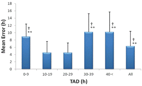 | Figure 6: Comparison of the mean error in the estimation of TAD, compared to the actual TAD in each of the 10-h TAD intervals, using corneal color analysis in photographs taken in room light. † P <0.01, compared to 10-19 h, ** P<0.01, compared to 20-29 h, TAD: Time after Death. |