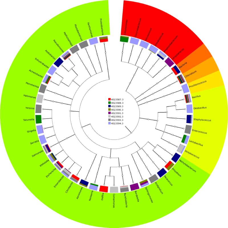 | Figure 3:Phylogenetic tree of the bacterial genera detected in the DNA dataset according to M5NR annotations. Figure 3 shows the phylogenetic tree of the bacterial genera detected in the metagenomic study according to M5NR annotations. Genera that belong to the same phylum were colored with the same color. This data was calculated for DNA dataset (4523587.3 (DNA1), 4523588.3 (DNA2), 4523589.3(DNA3), 4523590.3 (DNA4), 4523591.3 (DNA5), 4523592.3 (DNA6), 4523593.3 (DNA7) and 4523594.3 (DNA8)). The data was compared to M5NR using a maximum e-value of 1e-5, a minimum identity of 60%, and a minimum alignment length of 15. Maximum level was chosen to be genus, colored by phylum and the view was restricted to bacteria domain. It is noted from the figure that Proteobacteria is the dominant phylum followed by Firmicutes and Actinobacteria. |