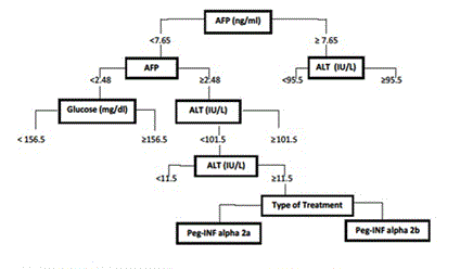 | Figure 2: Weka C4.5 decision-tree algorithm for the likelihood of SVR among chronic HCV patients. Boxes indicate the splitting factors and the branch points represent the cutoff value for the split. AFP:alpha feto-protein; ALT:alanine aminotransferase; PEGIFN: pegylated interferon. |