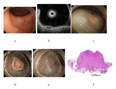 (C-EMR). (a) A 6-mm-diameter carcinoid tumor in the upper rectum. (b) Thinning of the third layer by endoscopic ultrasonography. (c) Submucosal injection with hyaluronic acid. (d) Circumferential mucosal incision with a needle knife. (e) After the resection by snaring. (f) The vertical distance of the resection margin was negligible from the lower edge of the tumor. |