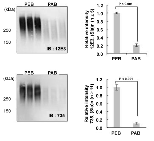 | Figure 2:Western-blotting analysis using polySia-specific antibodies. The PEB and PAB crude samples (10 μg as BSA/lane) were electrophoresed and blotted onto PVDF membrane. After blocking with 1% BSA, the membrane was probed with anti-polySia antibodies, 12E3 (1 μg/ml) specific to (Neu5Ac)5 or greater with non-reducing terminal end and 735 (0.8 μg/ml) specific to (Neu5Ac)11 were incubated. After washing, peroxidase conjugated anti-mouse IgG+IgM were incubated and color development was performed as described in Materials and Methods. Left panels show the results of Western-blotting. Right panels show the relative intensity of immunostained bands with antibodies and PEB value was set to 1.0. |