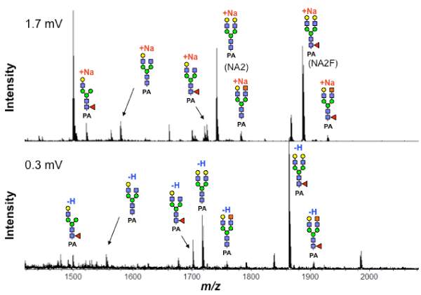 | Figure 1: MS spectra of PA-glycans obtained by MALDI-QIT-TOF MS. Glycans labeled with PA were detected as the [M+Na]+ or [M-H]- ions by MALDI-QIT-TOF MS. The MS spectra in positive (upper) and negative (lower) ions are shown. The schematic glycan structures are denoted for each signal in the chart. N-acetylglucosamine, Mannose, Fuc, Galactose and GalNAc are indicated as blue squares, green circles, red triangles yellow squares and orange squares, respectively. |