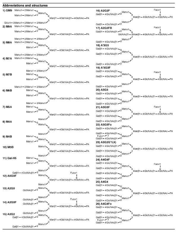 | Table 1: Abbreviations and structures of PA-N-glycans. All structures are shown as pyridylaminated (PA-) forms. The nomenclature of the oligosaccharide structures was reported previously [16,17]. N-acetylglucosamine; GlcNAc, mannose; Man, galactose; Gal, Glucose; Glc, fucose; Fuc. |