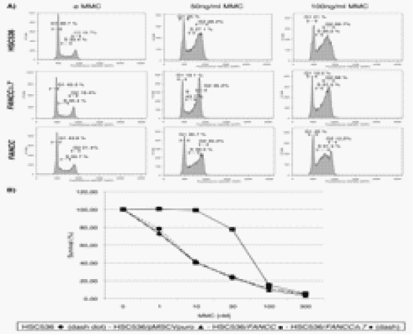 | Figure 4: Cell cycle profiles and survival assay. (A) FACs analysis of the FANCC- deficient cell line HSC536 infected with FANCC cDNA, FANCCΔ7 cDNA or not infected at all. Cells were treated with indicated concentrations of MMC for 24 hours prior to FACs analysis. (B) MMC-induced cell death. Differential survival of HSC536 (lozenge, dashed and dots), HSC536/ pMSCVpuro (triangle, full line), HSC536/FANCC (square, full line), HSC536/ FANCCΔ7 (circle, dashed line) cells after 5 days of incubation in escalating concentrations of MMC. The fraction of surviving cells was measured by the AlamarBlue assay. |