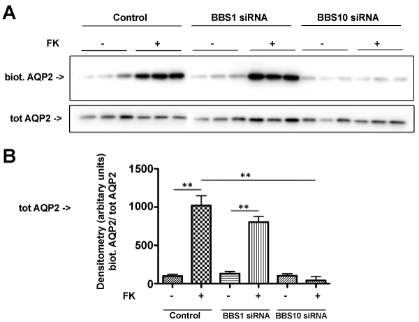 | Figure 5: BBS10 silencing prevents FK-induced AQP2 accumulation at the apical plasma membrane in renal MCD4 cells. Both BBS1- and BBS10-silenced MCD4 cells were either left under resting condition or stimulated with FK. Biotinylated apical proteins were isolated and immunoblotted with anti-AQP2 antibodies. After normalization for total AQP2 amounts, apical AQP2 was quantified by densitometry. Experiments were repeated three times with similar results (** P<0.02). |