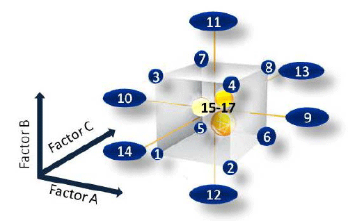 | Figure 5: Schematic concept of DoE, interactions between several factors monitored in parallel. Different types of DoE studies could combine factors, such as temperature, components in the media, pH; stoichiometries of reducing agents, buffers, salts and additives; PTMs, folding and activity during expression, purification and protein storage. The sequence and the number of factors depend on the study objectives. |