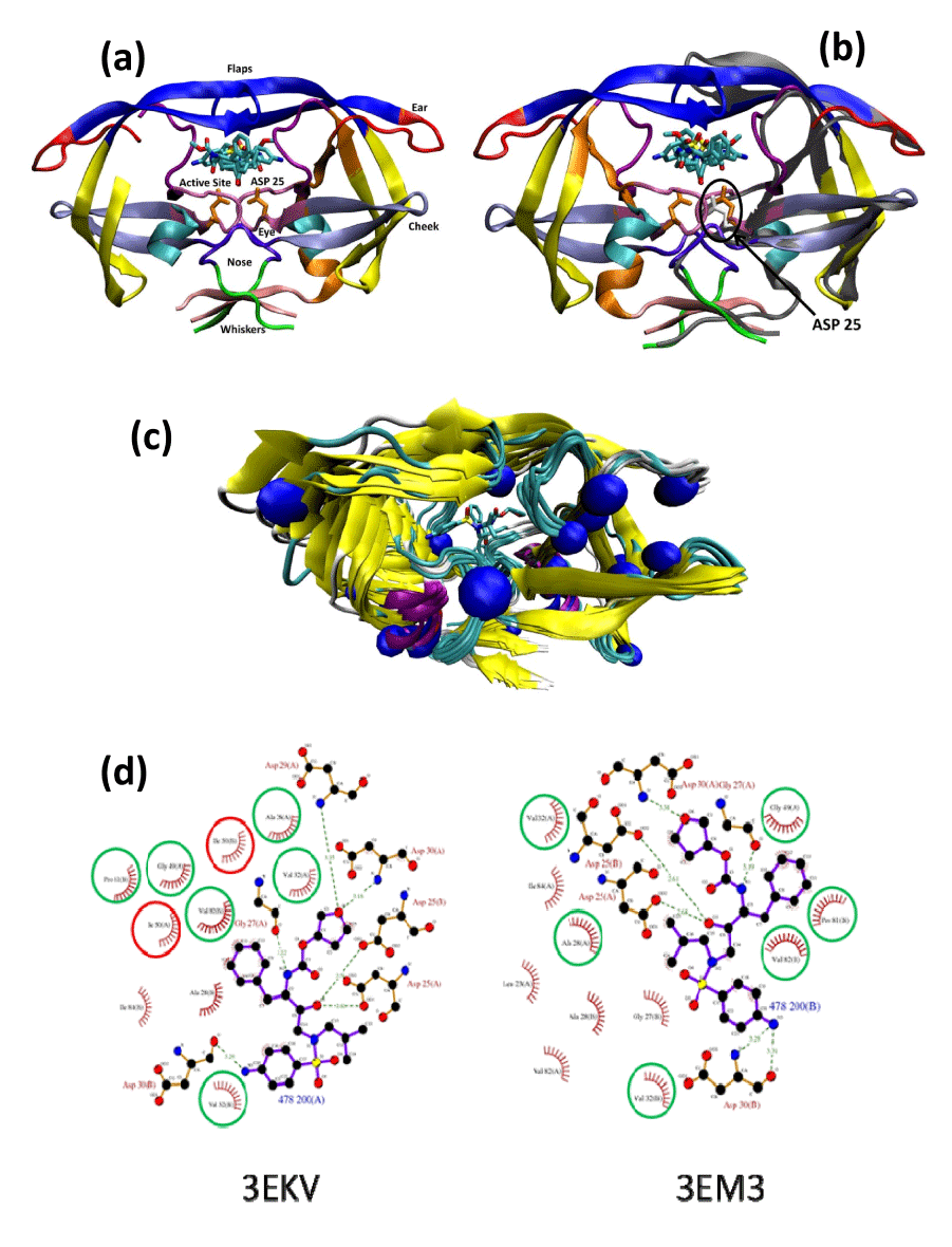 (c): Cα superposition of all 12 PDB structures complexed with amprenavir (see Table, Supplemental Digital Content 4, which shows the protease structures complexed