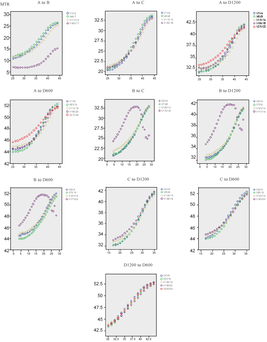 | Figure 4: Overlay scatterplots to compare pairs of scanners. They are the following in line sequential order: A to B, A to C, A to D1200, A to D600, B to C, B to D1200, B to D600, C to D1200, C to D600, D1200 to D600. Scan pairs are shown on the right. x axis: MTR values for scan 1; y axis: MTR values for scan 2 (in the pair). |