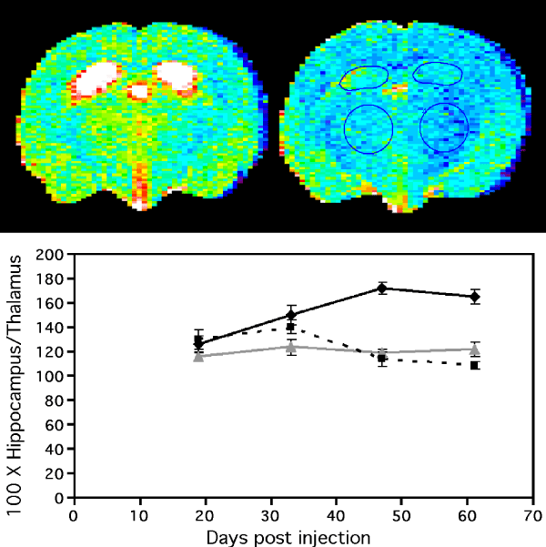 | Figure 3: Increased T2 relaxation time in the hippocampus of infected hamsters in MRI slice 6. Top, false colour T2-weighted MR images of infected (left) and uninfected (right) hamsters collected at 61 days post injection (dpi). Bottom, mean T2 relaxation time in the hippocampus expressed as a percentage of the mean T2 relaxation time in the thalamus, +/- standard error of the mean (s.e.m.). Solid black line: infected; broken black line: mock-infected; solid grey line: control hamsters. |