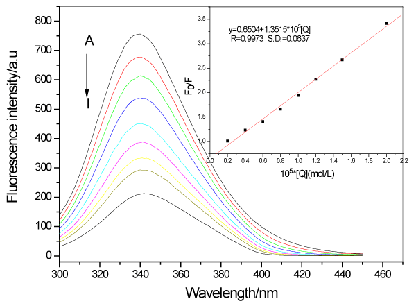 | Figure 2: fluorescence spectra of BSA in the presence of Tm-Por. at pH=7.40, 297K, λEx=280nm.c(BSA)=10μM; c(Tm-Por)/(10μM), A →I:0, 0.2, 0.4, 0.6, 0.8, 1.0, 1.2, 1.5, 2.0. Inset: the relationship of F0/F and the concentration of quenching agent Tm-Por. |