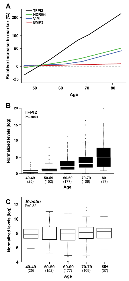 Figure 1: Relationship of age to stool marker levels. A. Relative changes per standard deviation of age are plotted for each marker. All four methylated gene markers (plotted as solid colored lines per inserted key) increased progressively with advancing age (p<0.0001 for each). In contrast to the methylated gene markers, β-actin levels (plotted as dotted gray line) were unaffected by age (p=0.32). B. Distributions by age of observed stool levels of methylated TFPI2, the marker most affected by age. C. Similar stool level distributions by age of β-actin, which served as the un-methylated human control gene.