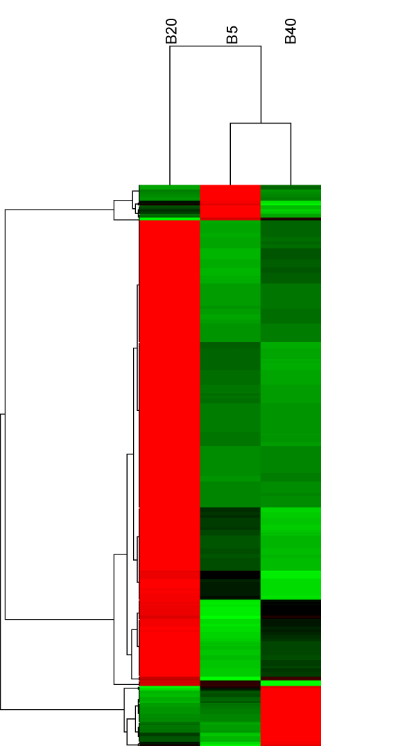 | Figure 1: Gene expression profiling. Hierarchical clustering diagram of BDE 209 induced expression changes. Jurkat cells were incubated with 5, 20 and 40 μM BDE 209 with DMSO (as control) for 48 h, all in triplicate. In the heatmap, rows represent individual genes and columns display the gene expression levels in each independent sample. Red color represents an expression level above the mean value of expression of a gene across all samples, black represents the mean and green color represents an expression level below the mean. |