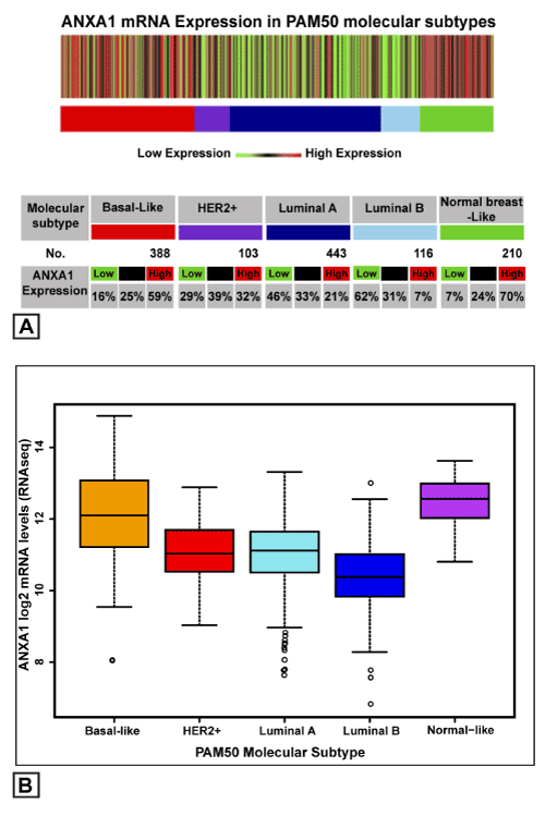 | Figure 1: ANXA1 mRNA expression in PAM50 molecular subtypes of breast cancer using bc-GenExMiner database v3.0. A. The figure and table show the patients with low, intermediate and high ANXA1 expression in each molecular subtype. The basal-like and normal-like subtypes contain more patients with high expression of ANXA1. In contrast, luminal A and B subtypes comprise more patients with low expression of ANXA1. B. TCGA mRNA sequencing dataset including 844 patients showing that ANXA1 is highly expressed in basal-like subtype. *** p-value < 0.001, Tukey’s test. |